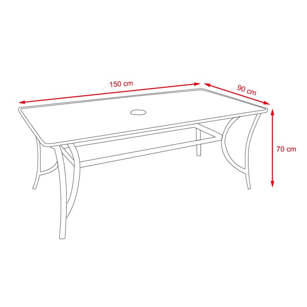 Doska stola s antiodtlačkovou úpravou z matného temperovaného skla, otvor so záslepkou na umiestnenie slnečníka.