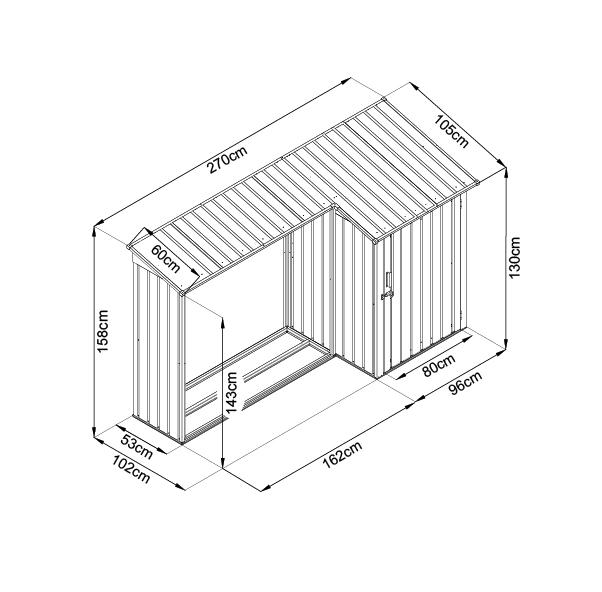 Tento záhradný prístrešok, ktorý sa skladá zo stojana na skladovanie palivového dreva a veľkého prístrešku, poskytuje teda dostatok priestoru na usporiadanie a uloženie vášho vonkajšieho náradia. Vzhľadom na to, že je vyrobený z pozinkovaného kovu, skladovací prístrešok vyžaduje minimálnu údržbu a má veľmi dlhú životnosť. Dažďová voda automaticky steká zo strechy, ktorá má šikmú konštrukciu.