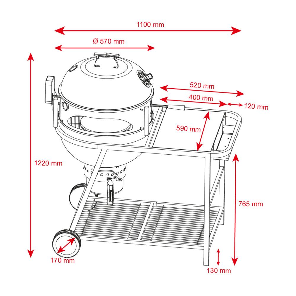 Konštrukcia grilu vychádza z robustného kotlového grilu s priemerom 57 cm, so smaltovanou povrchovou úpravou zaisťujúcou veľmi dobrú tepelnú odolnosť, ale aj dlhú životnosť. Tento je potom usadený do praktického vozíka na kolieskach poskytujúci dostatočnú pracovnú plochu a priestor na odloženie grilovacieho náradia či náčinia.