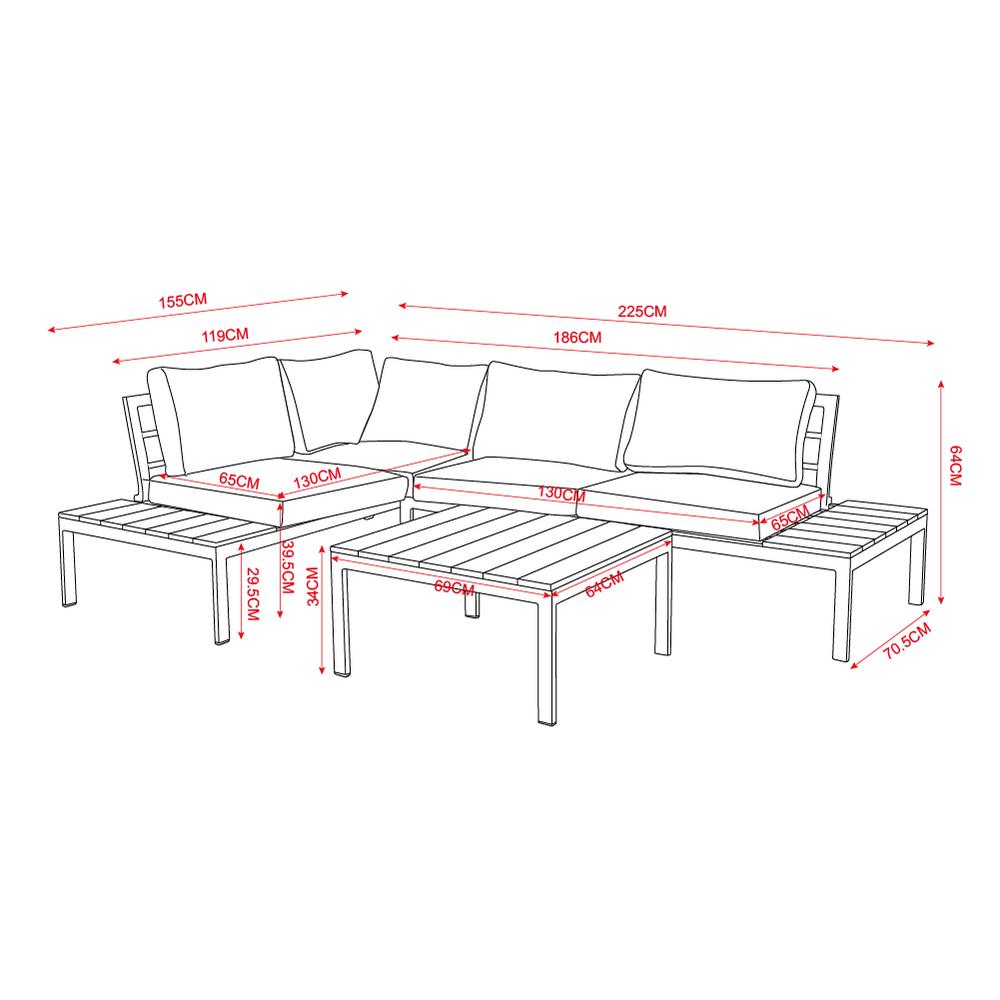 Rohový set záhradného nábytku v modernom dizajne obsahuje komfortnú rohovú pohovku s mäkkými vankúšmi, bočné odkladacie plochy a stolík. Stabilnú kovovú konštrukciu dopĺňa odolná imitácia dreva, nábytok je tak praktický pre jeho ľahkú údržbu. Skvelo vynikne v záhrade aj na modernej terase.