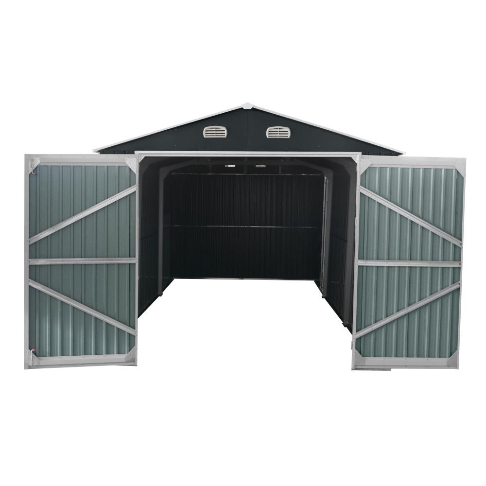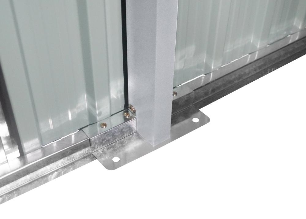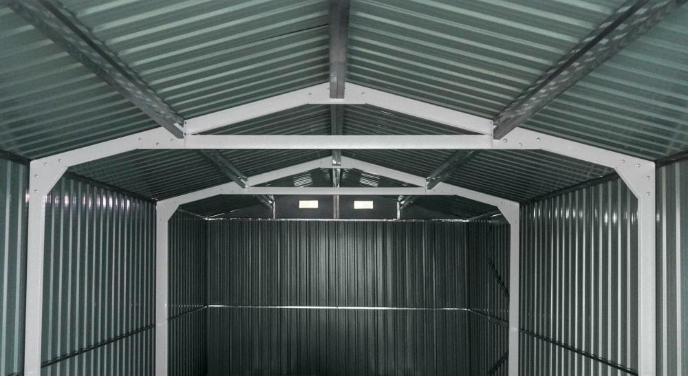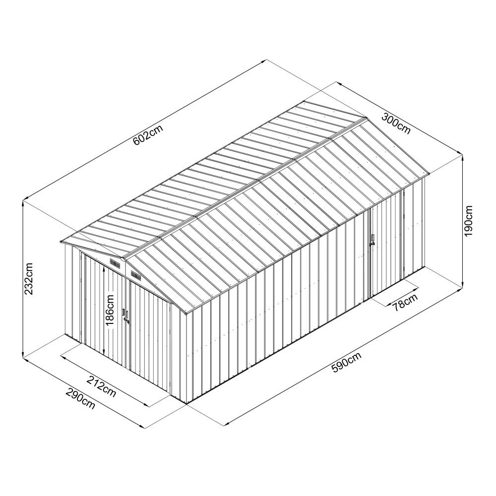 Kovový záhradný domček, garáž s rozmermi 602×300 cm je vyrobený z profilovaného plechu a so silou steny 0,3 mm. Zastavaná plocha domčeka je 17,11 m2. Bočné zabudované dvere poskytujú komfort bočného východu z domčeka. Čelné dvojkrídlové brány o rozmere 212 x 186 cm sú dostatočne veľké aj pre väčšie automobily typu SUV.
