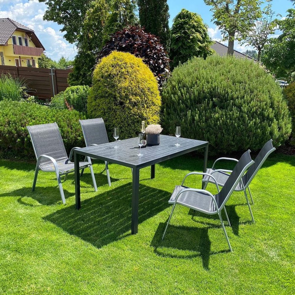 Záhradný set VIKING L + RAMADA/ALINA sa skladá z veľkého stola a štyroch kovových stohovateľných stoličiek.