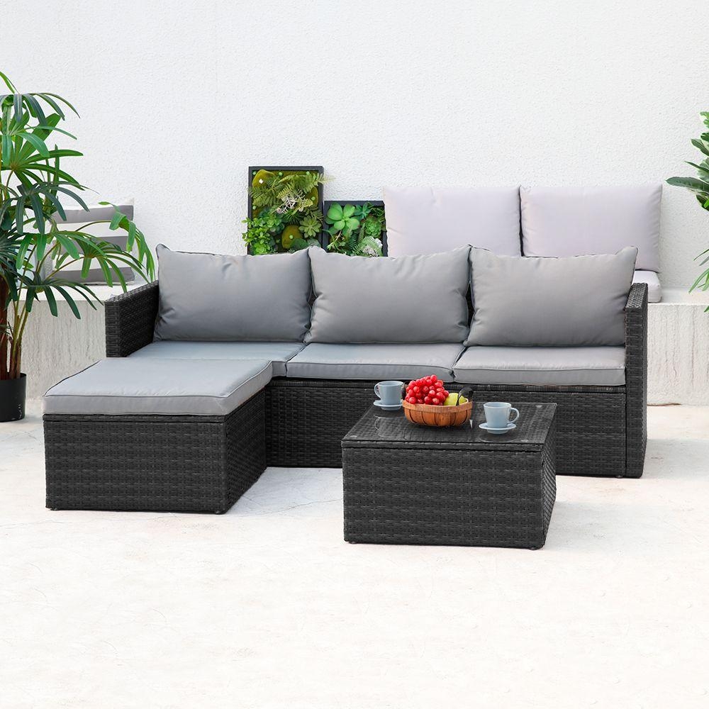 moderná ratanová zostava v elegantnom čiernom prevedení so svetlo šedým čalúnením ponúka pohodlné sedenie až pre 4 osoby – ideálna na popoludňajšiu siestu, večerný drink alebo nedeľný brunch s priateľmi.