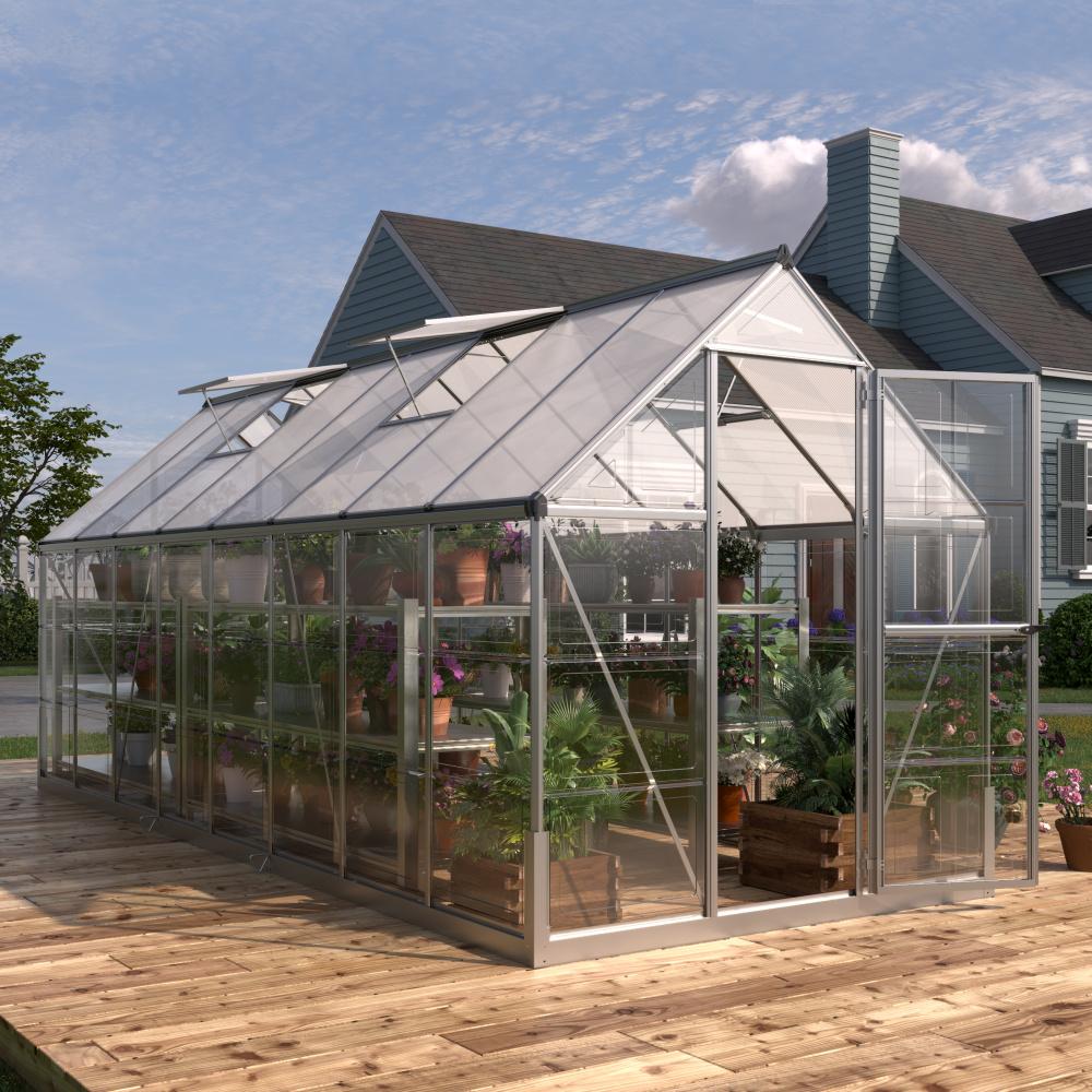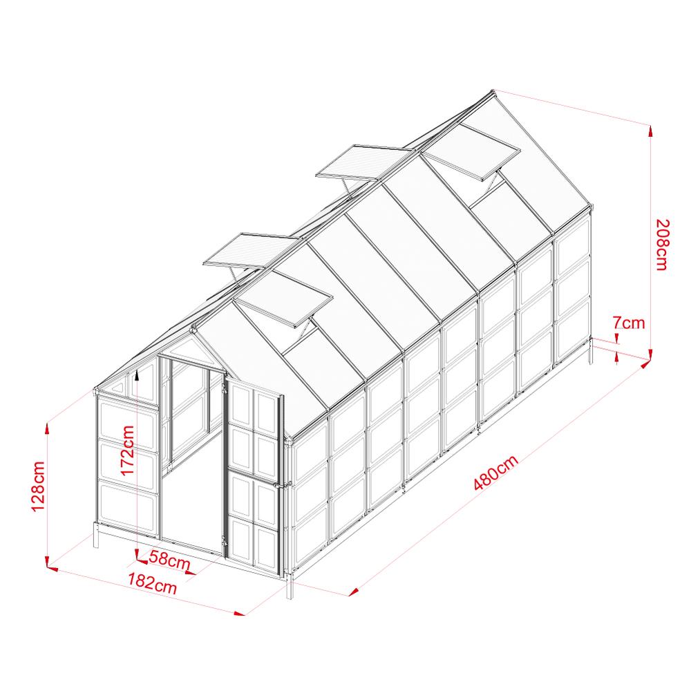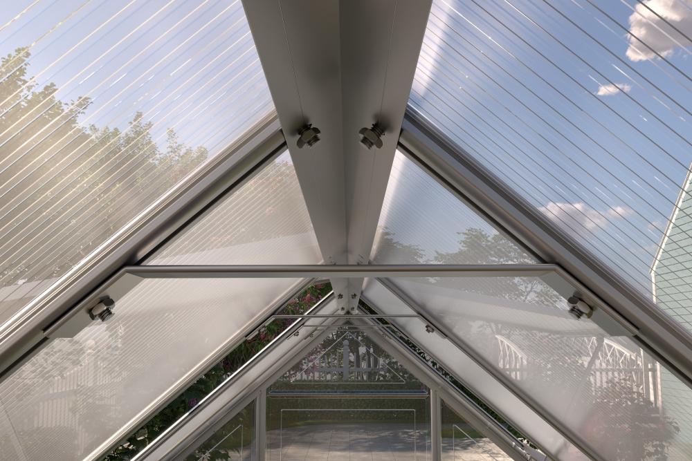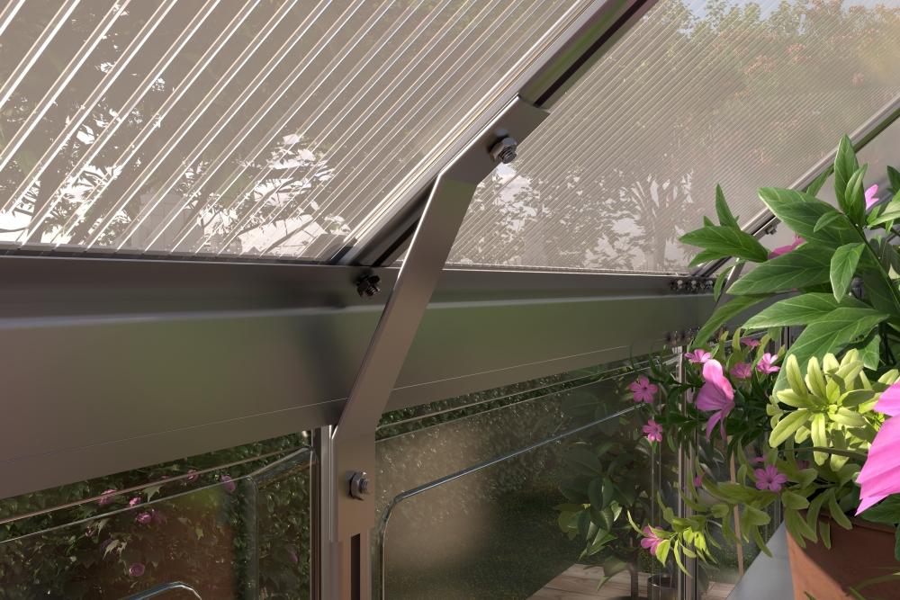 Odolná konštrukcia a kvalitný polykarbonát Rám skleníka je vyrobený z eloxovaných hliníkových profilov, ktoré sú odolné voči korózii a zaisťujú pevnosť konštrukcie. Presklenie tvorí polykarbonátové dosky s UV filtrom, ktoré skvele izolujú teplo a zároveň chránia rastliny pred škodlivým slnečným žiarením. Vďaka H-profilovému uchyteniu dosiek je skleník extrémne stabilný a odolný voči vetru.