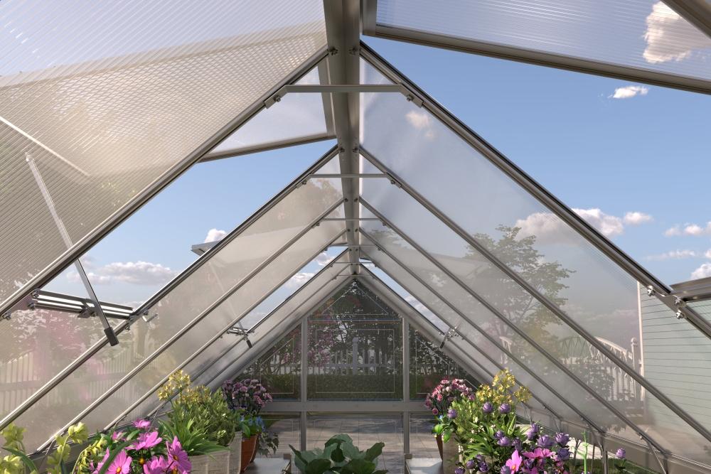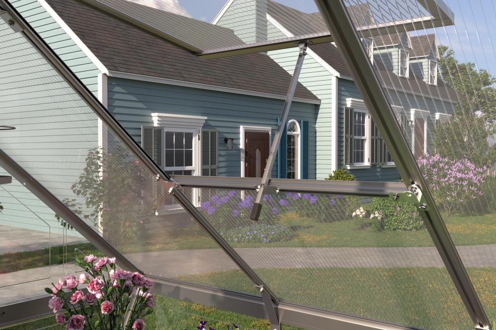 Premyslené detaily pre maximálny komfort Skleník je vybavený štyrmi výklopnými ventilačnými oknami, ktoré umožňujú jednoduchú reguláciu teploty a vlhkosti. Jednokrídlové pántové dvere uľahčujú prístup a zaisťujú pohodlnú manipuláciu s rastlinami aj záhradným náradím.