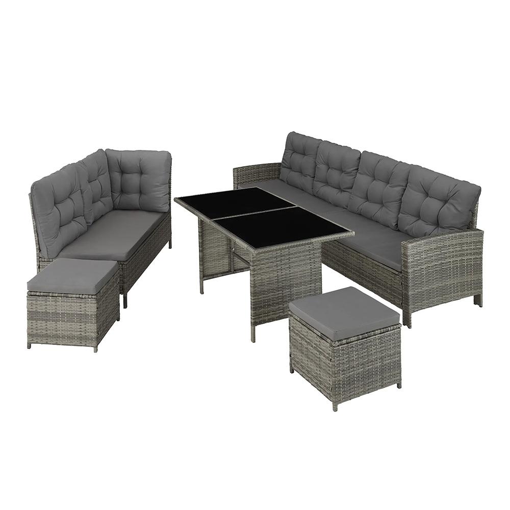 Užite si príjemné a spoločenské chvíle s rodinou alebo priateľmi na pohodlnej súprave z ratanu. Mäkké vankúše na stoličkách majú ďalšie využitie ako sedadlá alebo pohodlné opierky nôh a poskytujú uvoľnené chvíle v obývacej izbe ako na čerstvom vzduchu. Jednotlivé prvky sedadiel je možné jednoducho usporiadať podľa svojho vkusu. Silná základňa a kvalitný výplet vyrobený z polyratanu zaručí vysokú odolnosť tomuto ratanu.