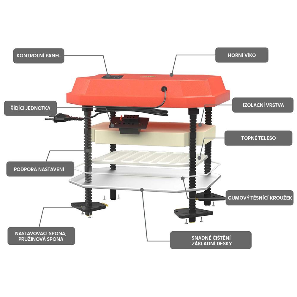 Ohrievač kuriatok vyrobený z kvalitného plastu je dobre izolovaný, takže nedochádza k stratám tepla. Hliníková spodná strana zaisťuje rovnomerné rozloženie tepla.