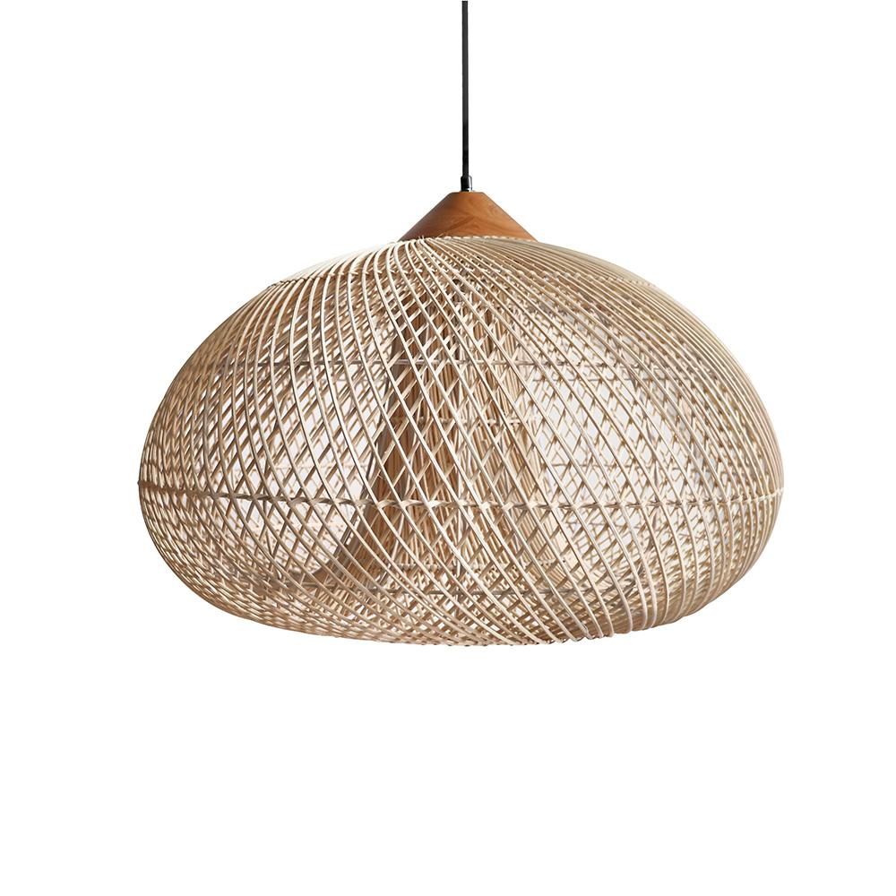 Elegantný dizajn: Jemné pletenie ratanu a drevený detail na vrchole lampy tvorí nadčasový doplnok. |
