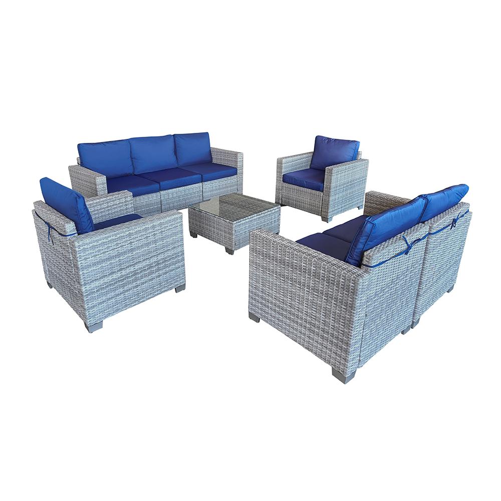 Veľká záhradná sedacia súprava Avenberg DORADA – šedý ratan s modrými aj béžovými poduškami v balení