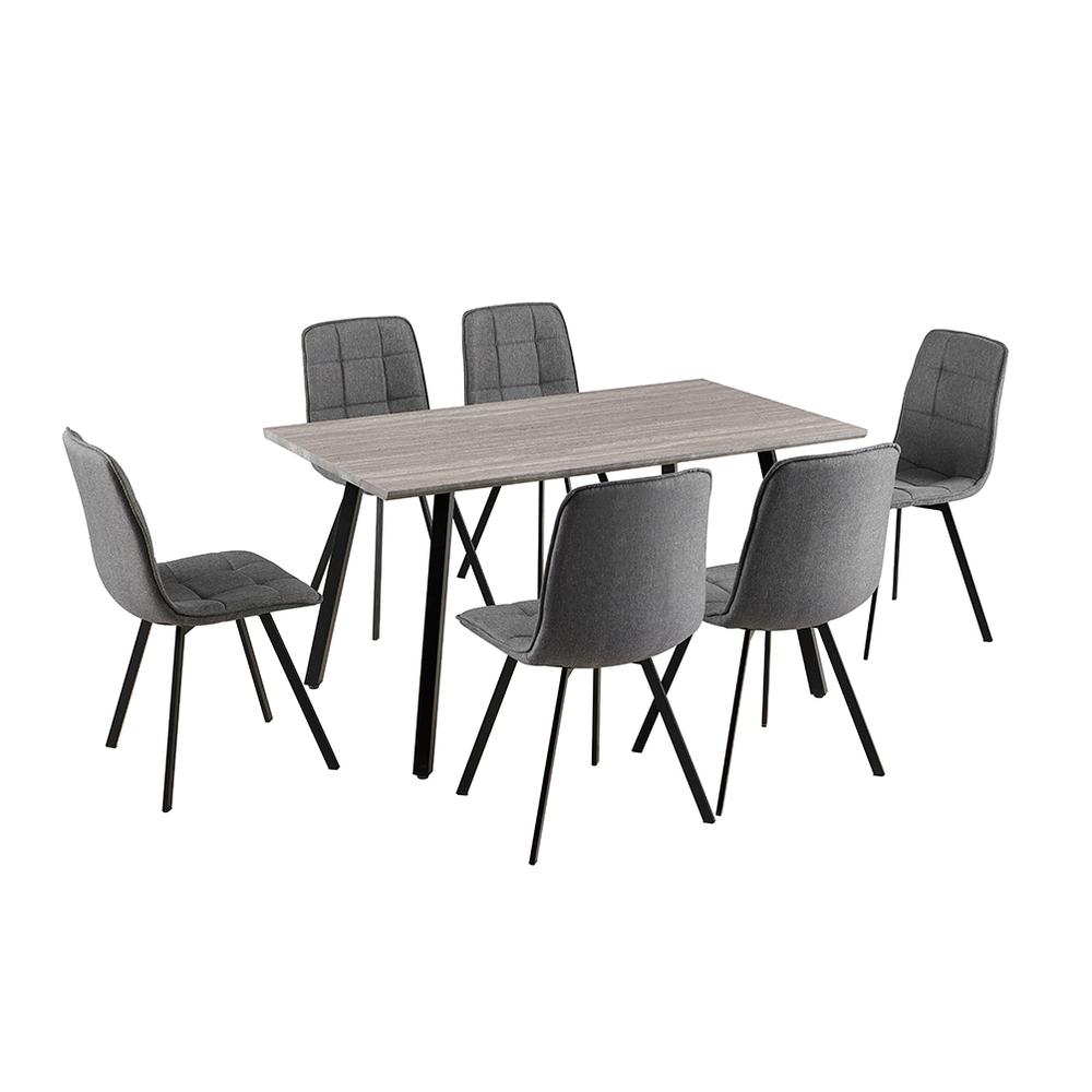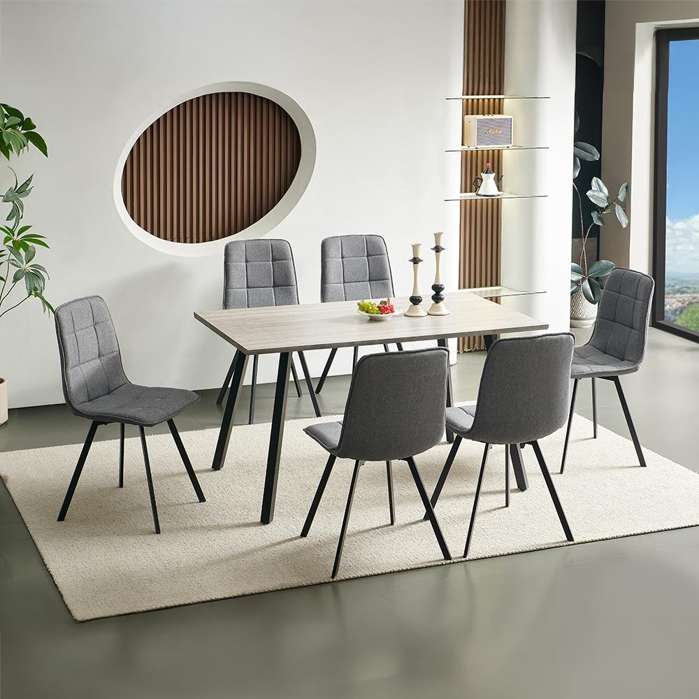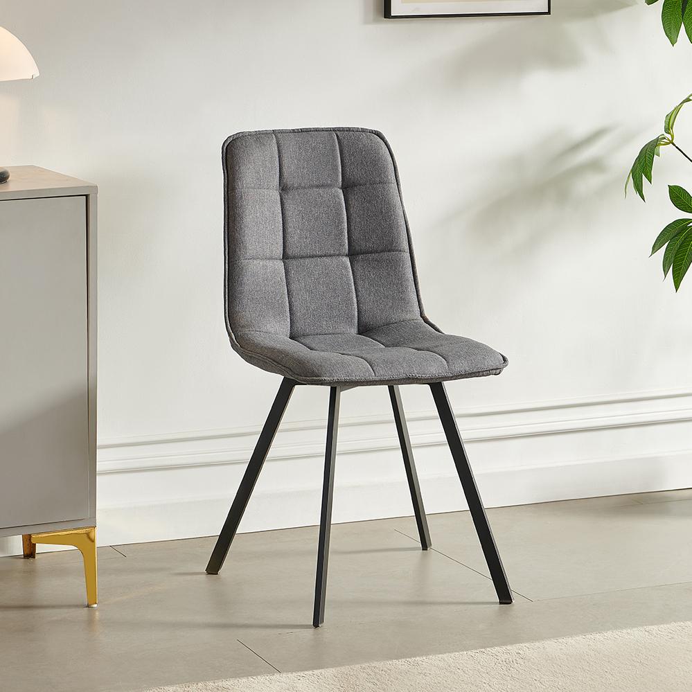 Stoličky potiahnuté sivou látkou majú vysoké operadlo s dekoratívnym prešitím a pohodlným sedákom. Brúsené čierne kovové nohy zaisťujú nielen stabilitu, ale aj dizajnovú jednotnosť so stolom.
