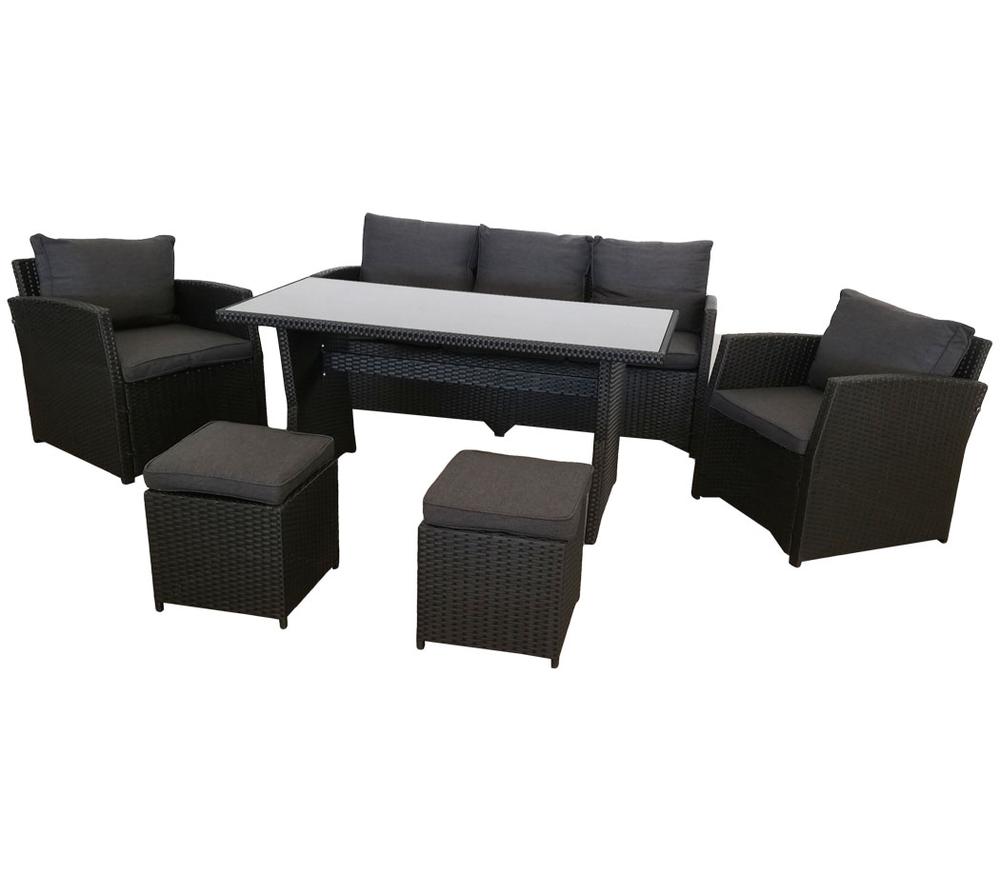 Odolný čierny umelý ratan v kombinácii s pevnou oceľovou konštrukciou a 7 cm hrubými antracitovými vankúšmi zaručuje nielen pohodlie, ale aj dlhú životnosť bez zbytočnej údržby. A stôl s doskou z tvrdeného skla? Bez problémov unesie ťažké hrnce a plné taniere.