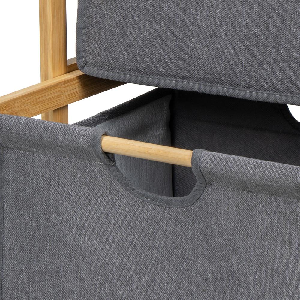 Bambusový regál AVENBERG BAMBU DUO kombinuje prírodný bambus s praktickými látkovými zásuvkami v sivej farbe. Hore máte odkladaciu plochu na uteráky, kozmetiku alebo dekorácie, dole zase dve „úložiská“ na drobnosti, ktoré by sa inak váľali všade po celom byte.