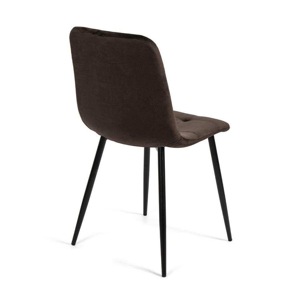 zamatové stoličky v tmavohnedej a čierne kovové nohy – kombinácia, ktorá zaujme a pritom zostáva nadčasová.