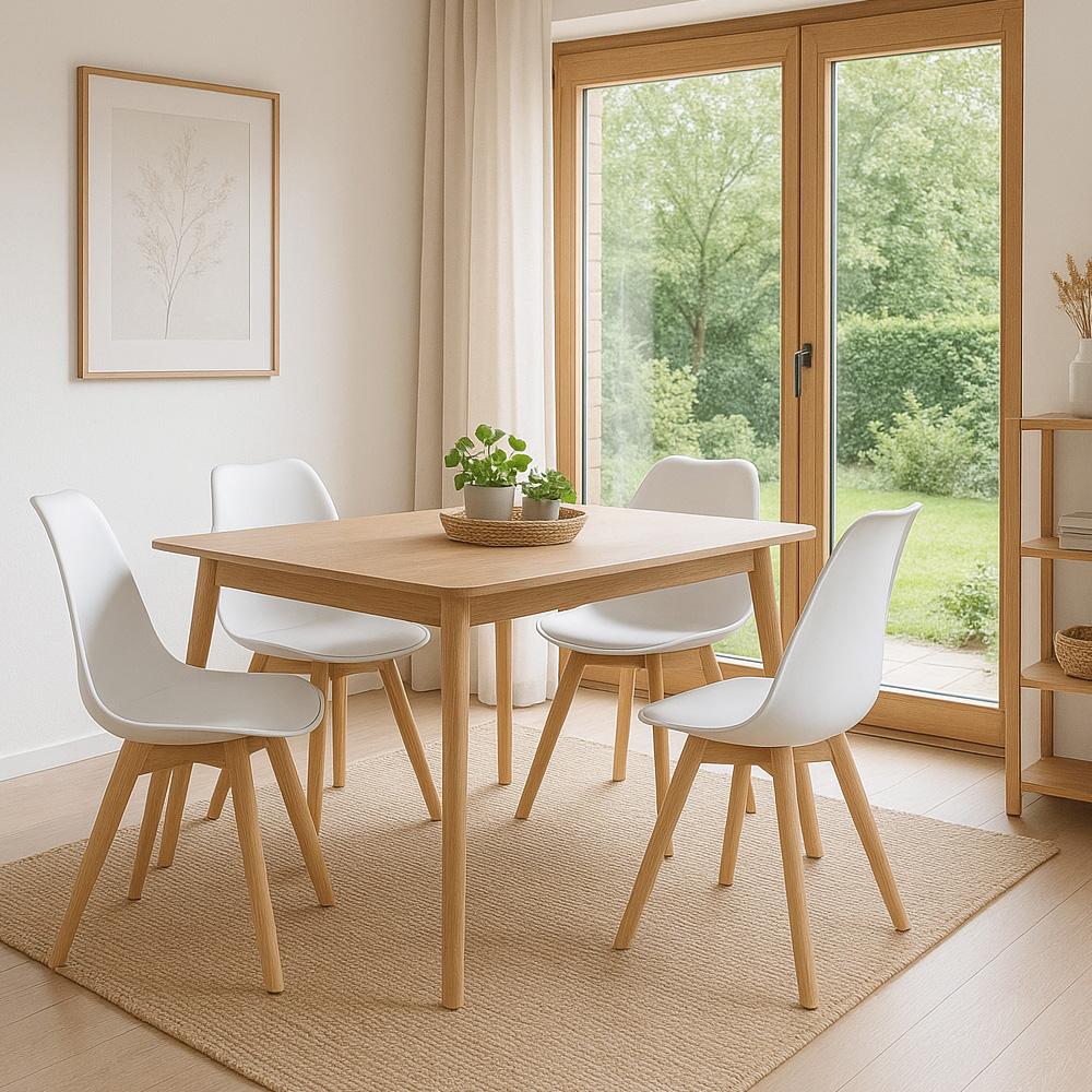 Ľahká škandinávska klasika, ktorá rozžiari jedáleň – biela škrupina, prírodné drevo a čistý dizajn.