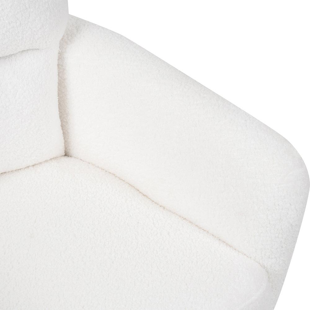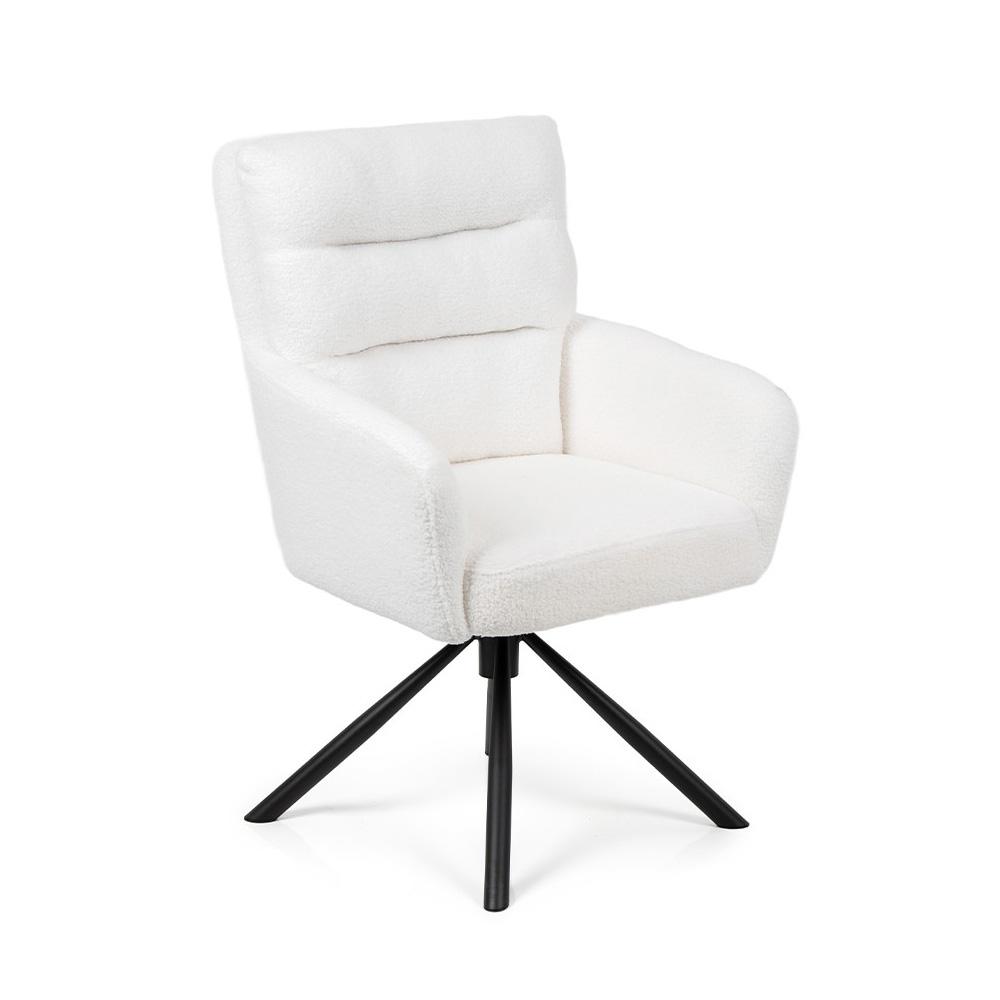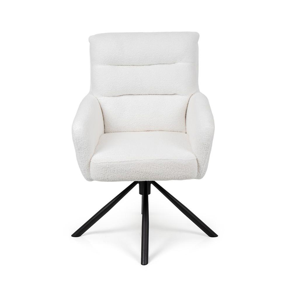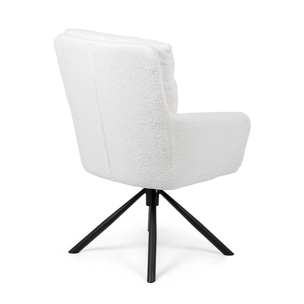 Bouclé poťah v bielej farbe pôsobí útulne a luxusne, čierna kovová podnož dodáva stabilitu a kontrast. Vďaka