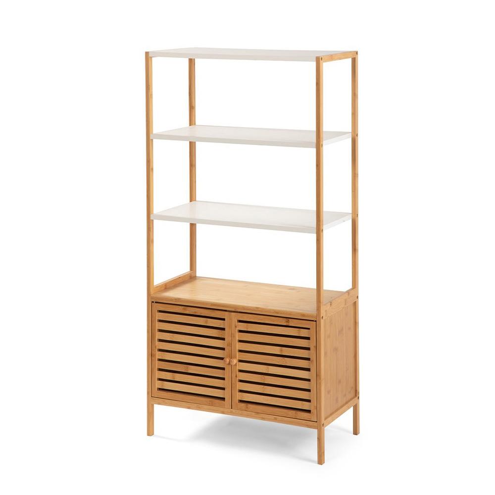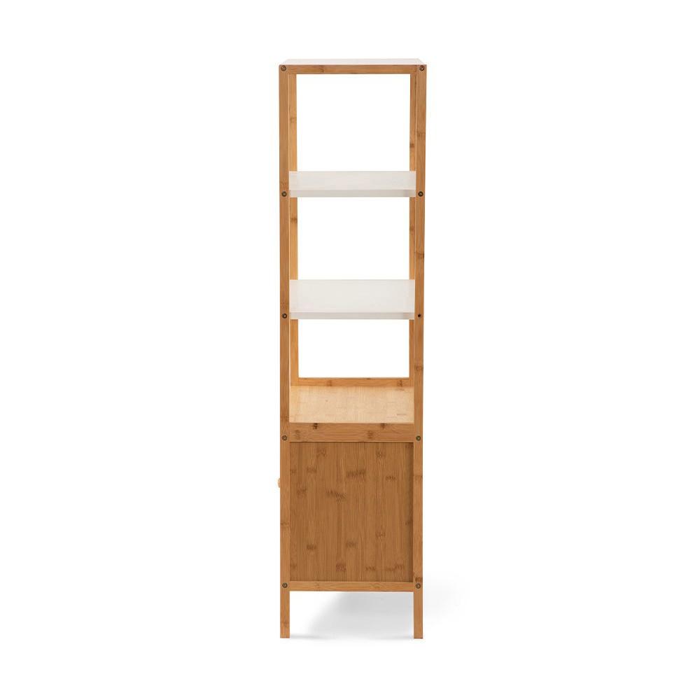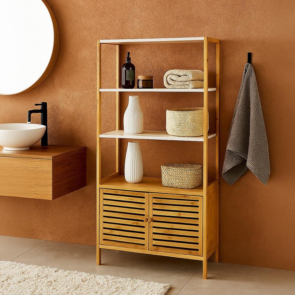 Bambusová skrinka s bielymi policami je praktické úložné riešenie do kúpeľne, predsiene aj spálne. Kombinuje