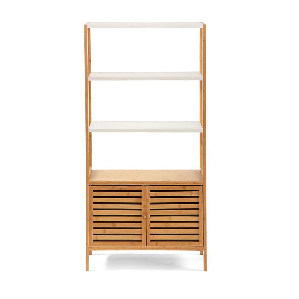 Prírodný bambus, biele police a uzatvárateľný úložný priestor – štýlová skrinka, ktorá urobí poriadok aj dojem.