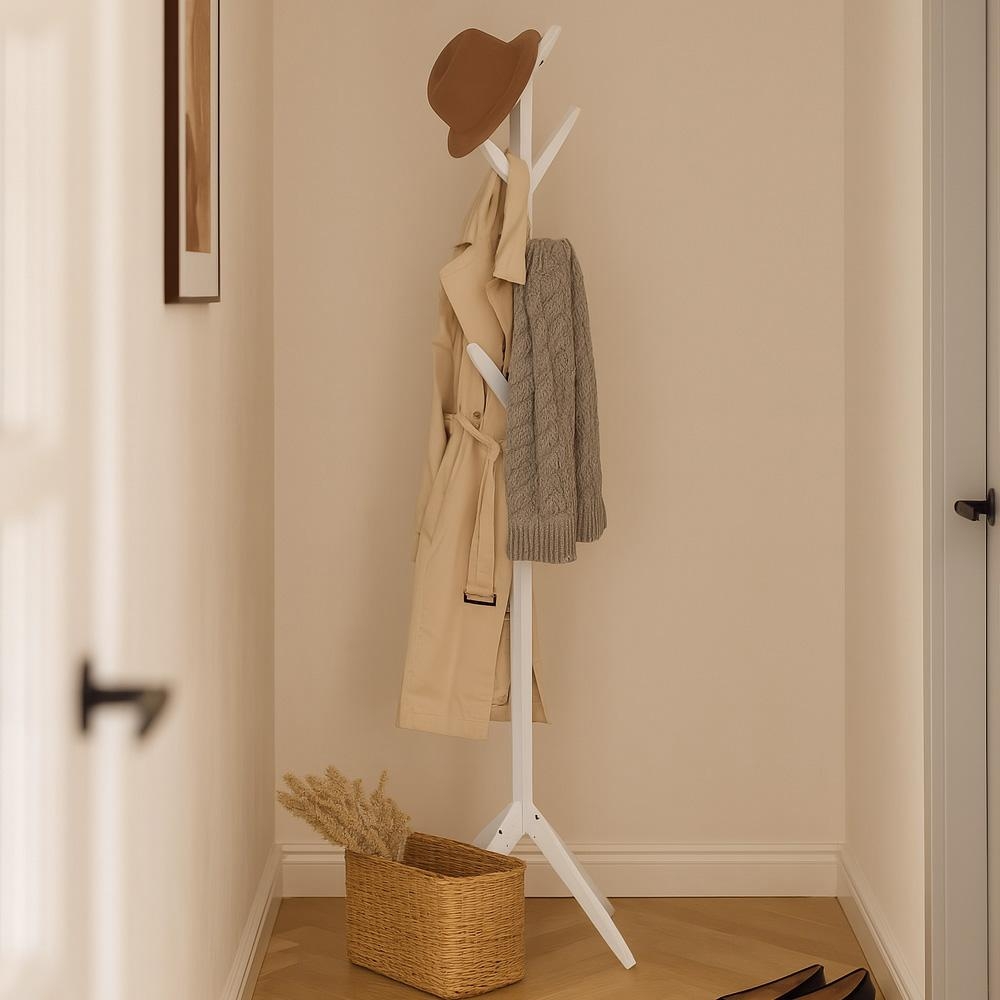 Biely „stromový“ vešiak z borovicového dreva – čistý dizajn, ktorý rozjasní predsieň a udrží kabáty poruke.