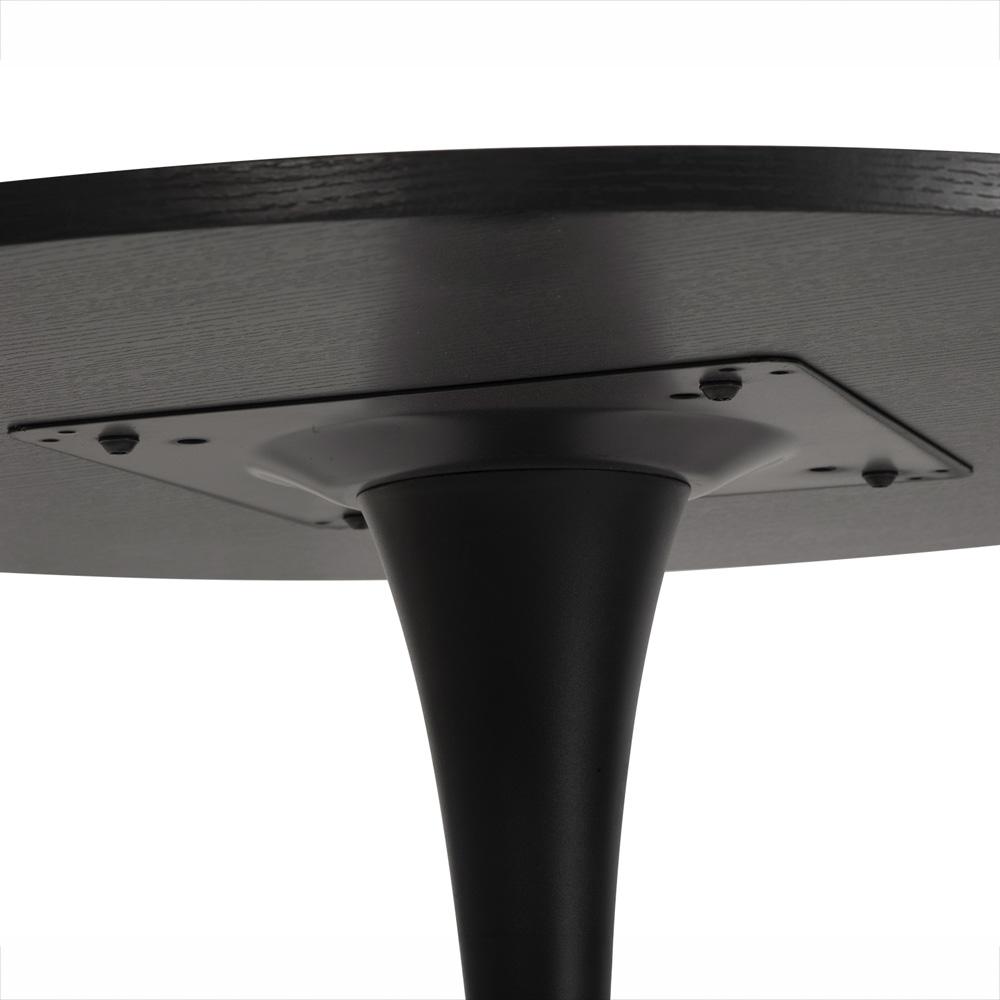 Okrúhly jedálenský stôl v čiernej farbe s jemnou štruktúrou dreva – elegantný dizajn s centrálnou podnožou na pohodlné sedenie.
