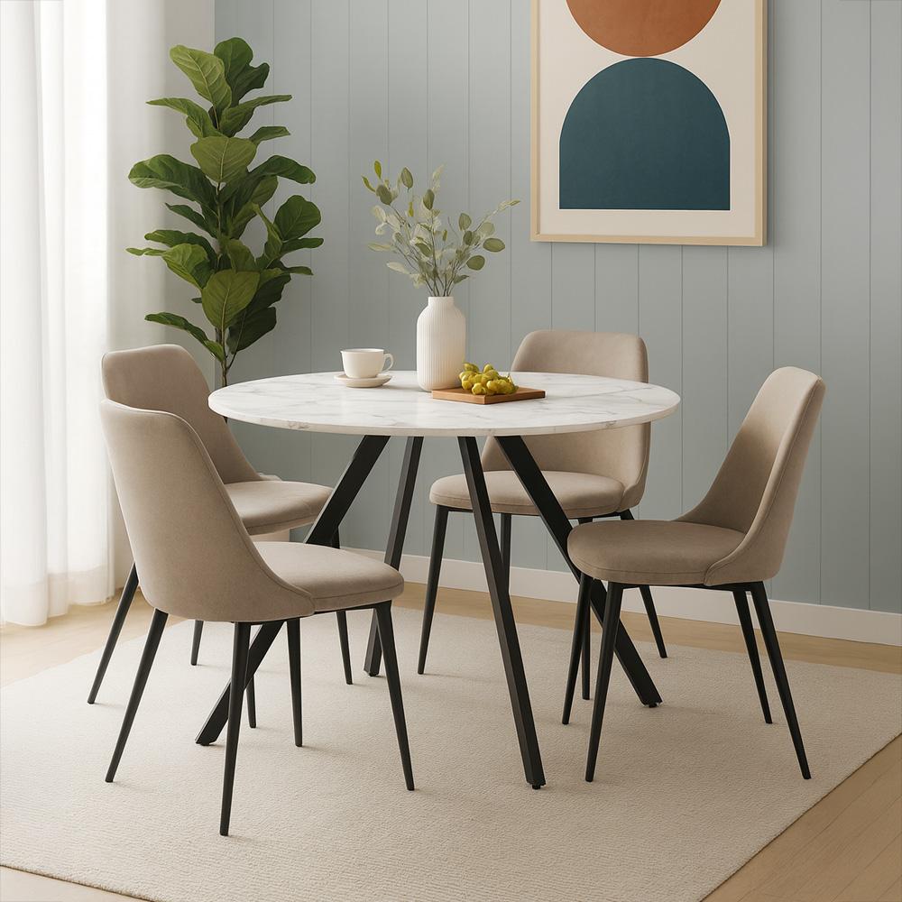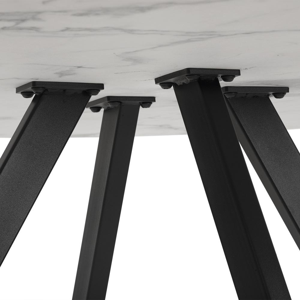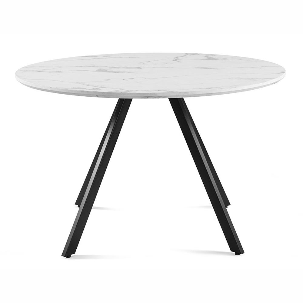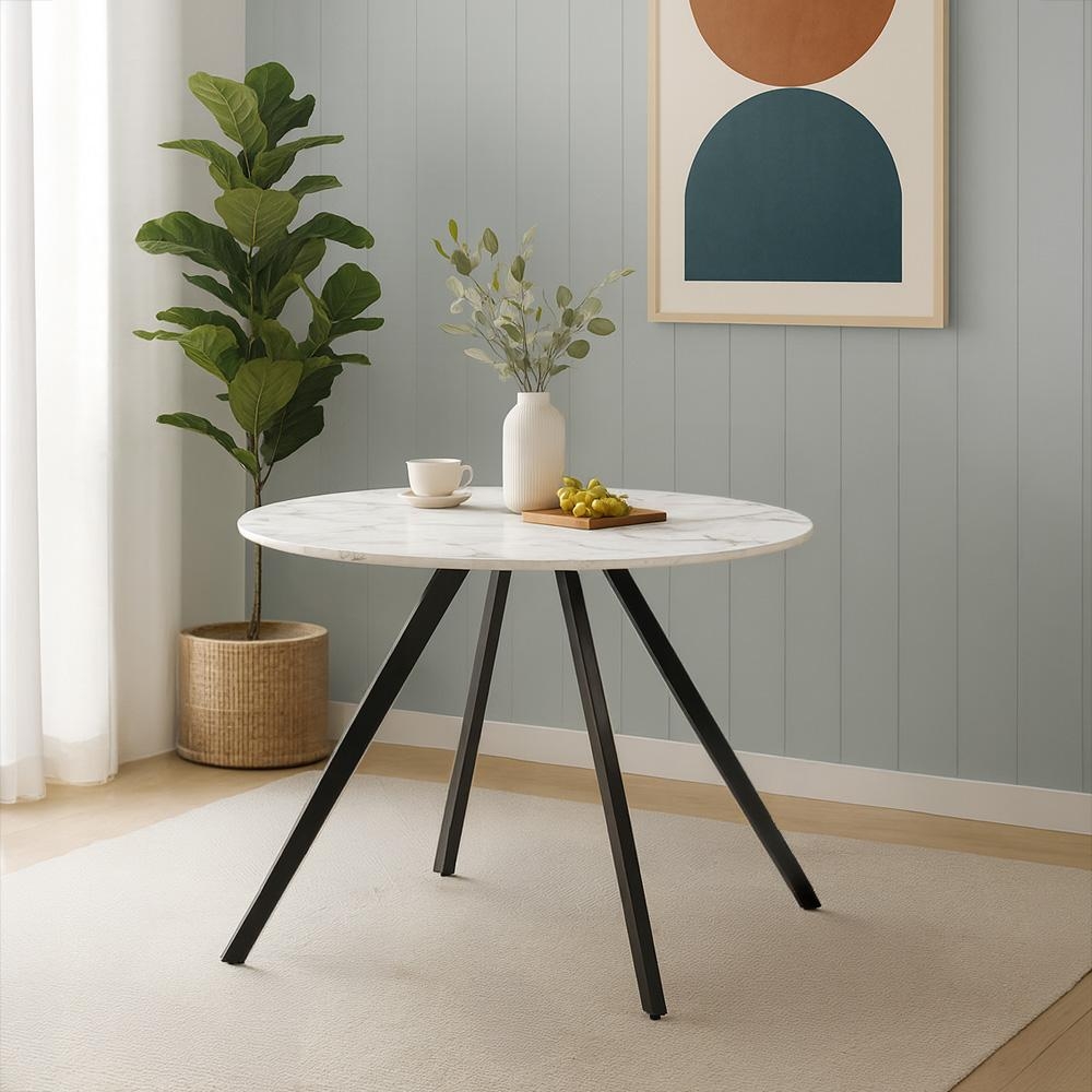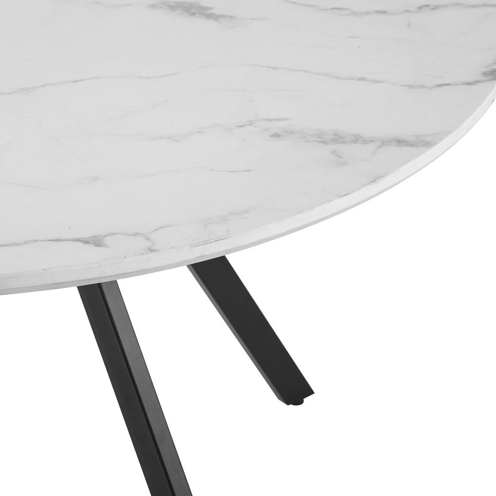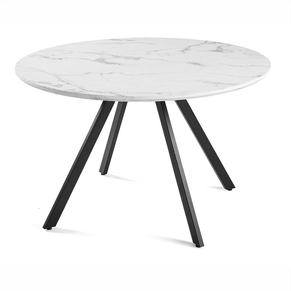 Veľký okrúhly jedálenský stôl v bielom mramorovom dekore s čiernou kovovou podnožou – elegantný kontrast a pohodlné stolovanie pre celú rodinu.