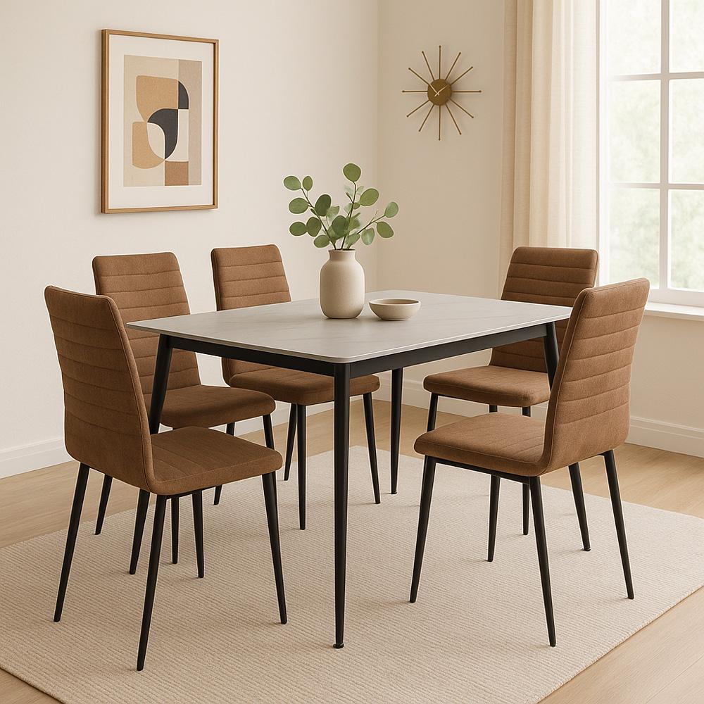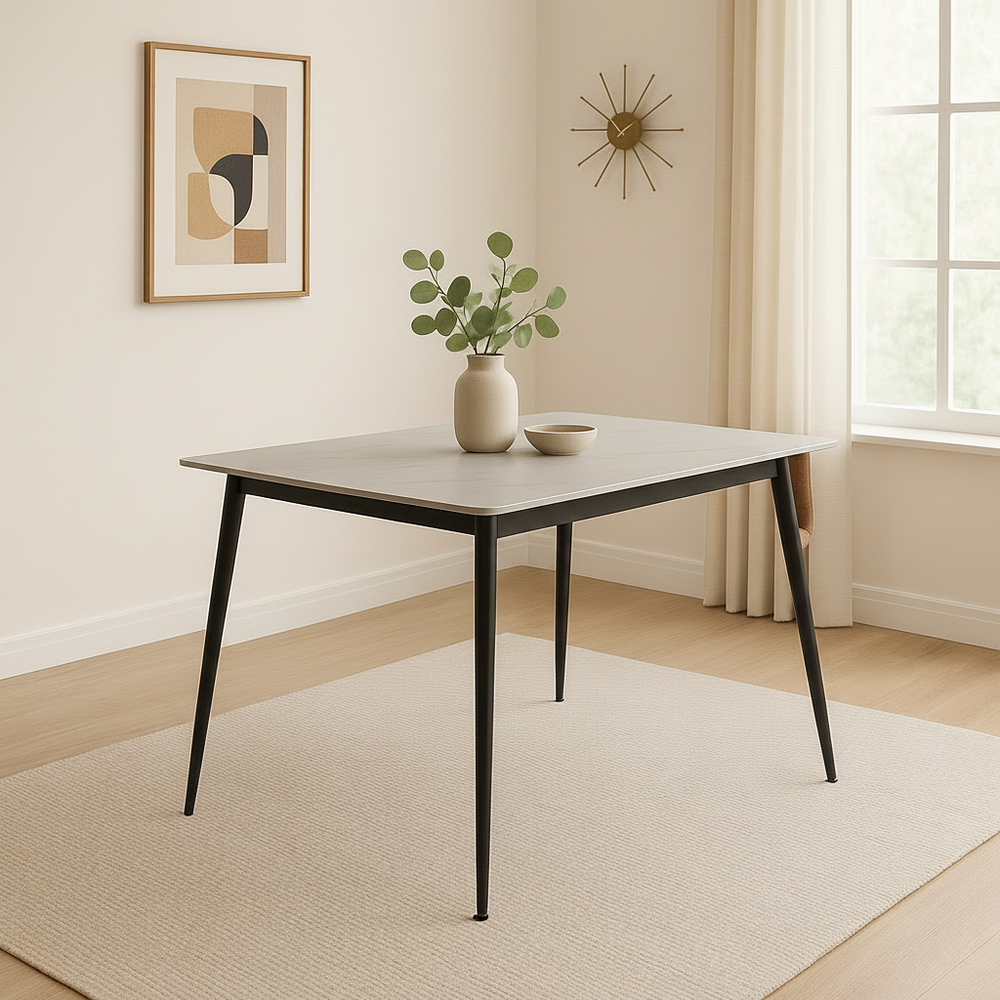 Moderná kombinácia svetlého mramorového dekoru a čiernych kovových nôh pôsobí čisto, elegantne a nadčasovo. Vďaka keramickej doske je stôl praktický na každodenné používanie a rozmer 120 × 80 cm skvele pasuje do kuchyne aj jedálenského kúta.
