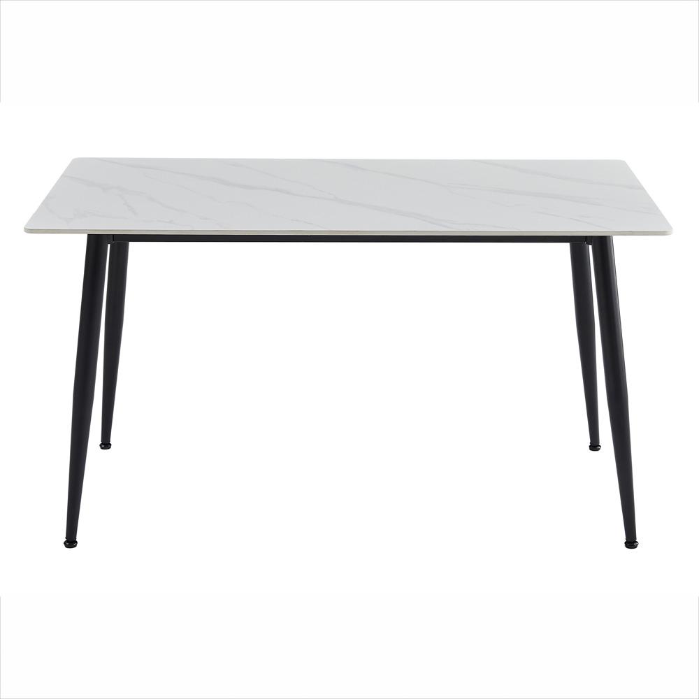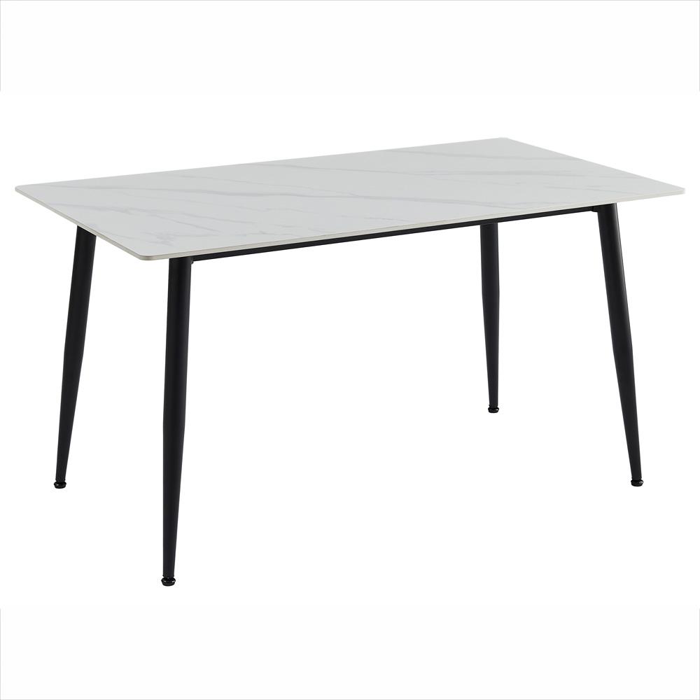 Jedálenský stôl AVENBERG Monte – matná keramická doska v bielom mramorovom dekore a stabilná čierna oceľová podnož.
