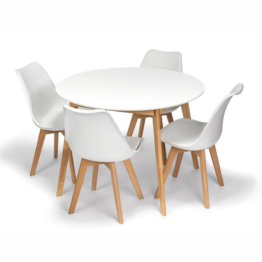 AVENBERG PEARL – svetlý škandinávsky jedálenský set pre 4 osoby s okrúhlym stolom Ø105 cm a štyrmi stoličkami, ktorý bude vyzerať skvele v každej kuchyni aj jedálni.